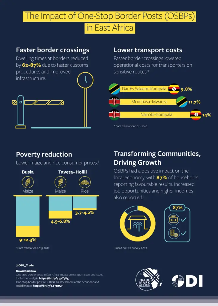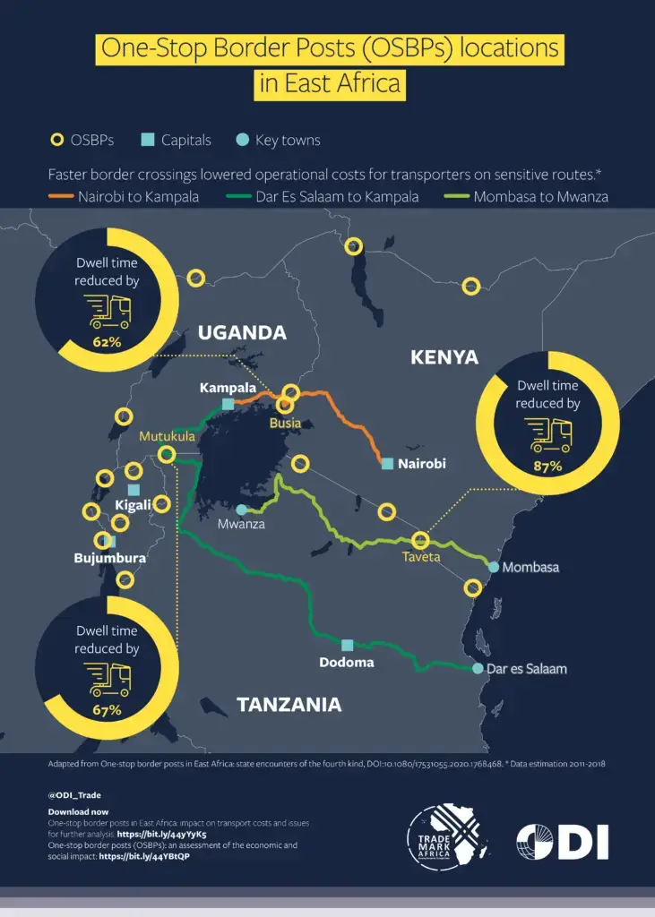 Over 20 One Stop Border Posts constructed or operationalised across Eastern and Horn of Africa. Time to cross select OSBP’s reduced by an average of 70%. TMA supported construction and operationalisation of 15 OSBPs across the EAC region.